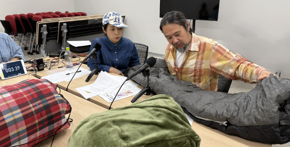 会議かと思うような真剣に寝袋を吟味する2人。この真剣な模様は番組をお楽しみに!!
